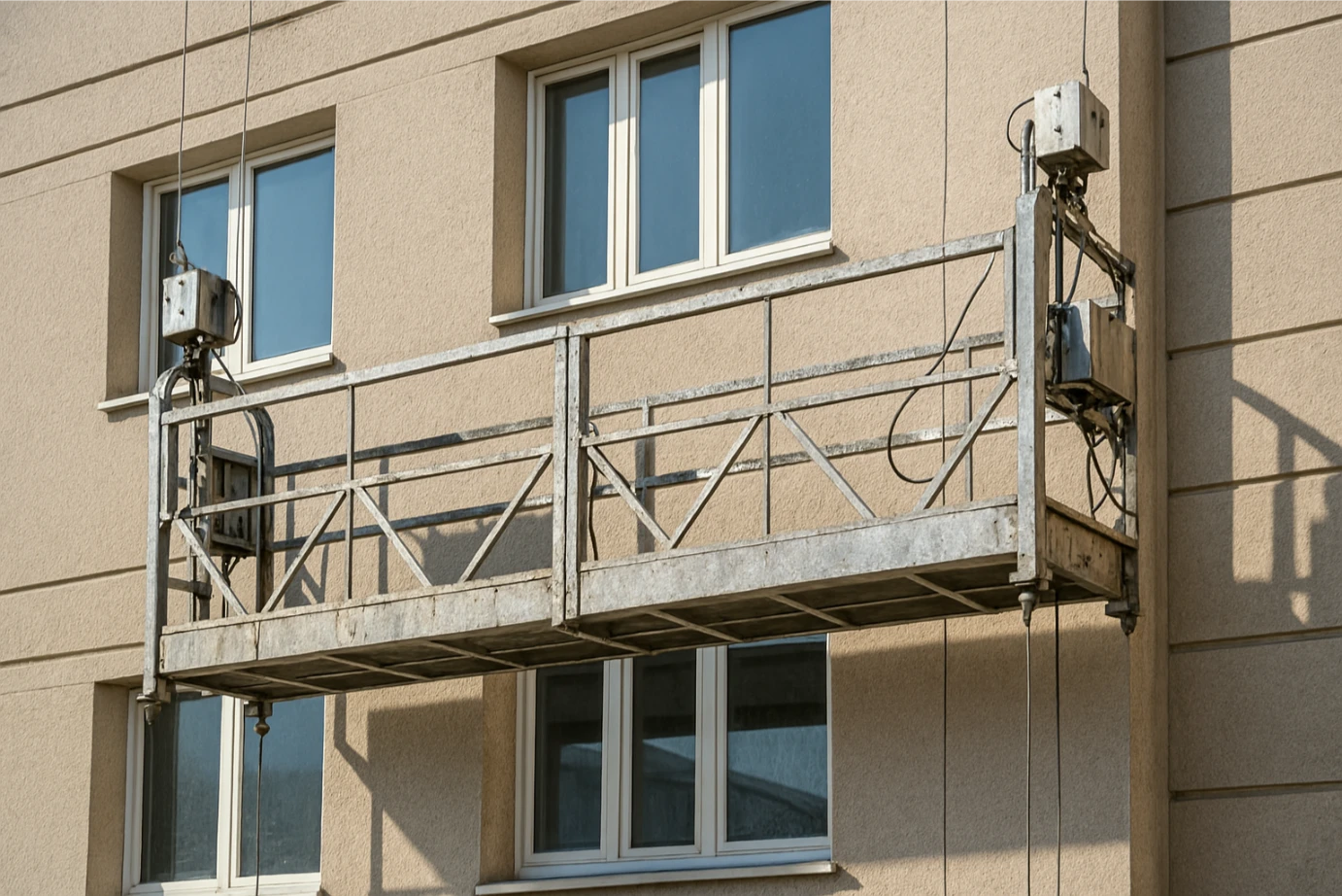 Los andamios colgantes (también llamados plataformas suspendidas motorizadas) son la solución más práctica para realizar trabajos verticales como pintura, limpieza o rehabilitación de fachadas, sin necesidad de ocupar espacio en el suelo.